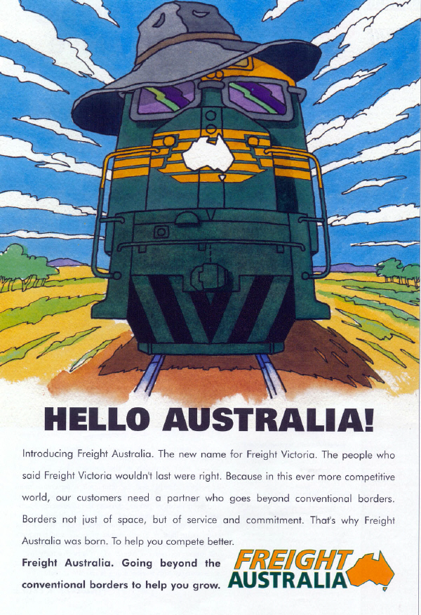 Advertisement published in April 2000 to introduce the change of name for Freight Australia. Source: Track & Signal Magazine