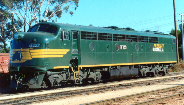 S303 was leased to Freight Australia by its owners, the Seymour Railway Heritage Centre, to make up for a shortage in large horsepower locomotives. On 14-5-2002, S303 was at Mildura on second engine duties. Photo: Bruce McLean