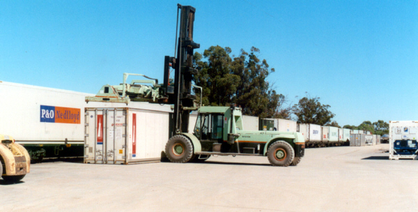 Forklift handling containers at Wakefield Transport intermodal depot at Merbein. 14-4-2002. Photo: Bruce McLean