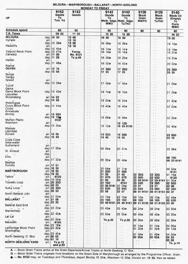 The following timetables have been extracted from Master Train Plans and Network Service Plans (Internal operating documents) published by the Public Transport Corporation and later, the Victorian Rail Track Corporation. The timetables shown are representative of the train services for the lines covered in this history.