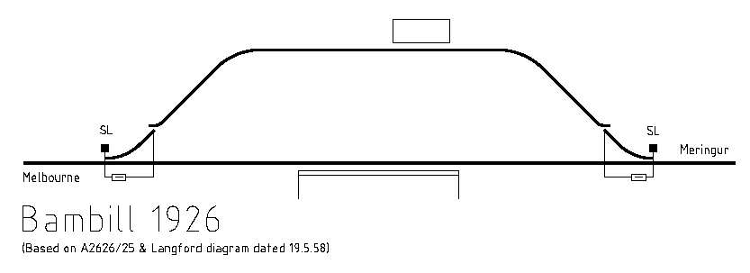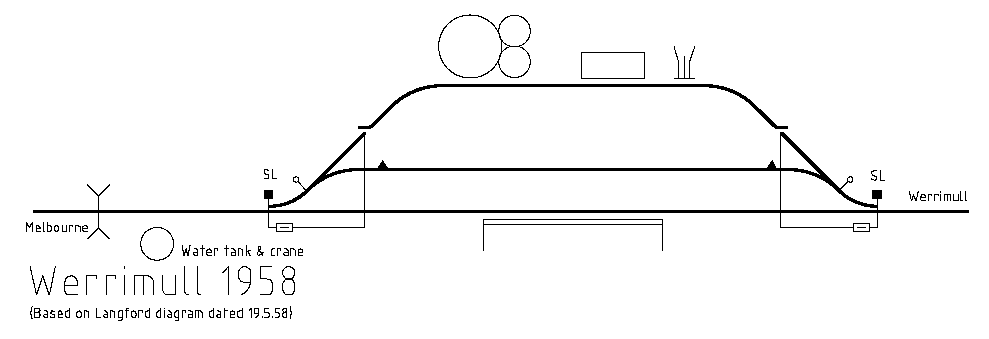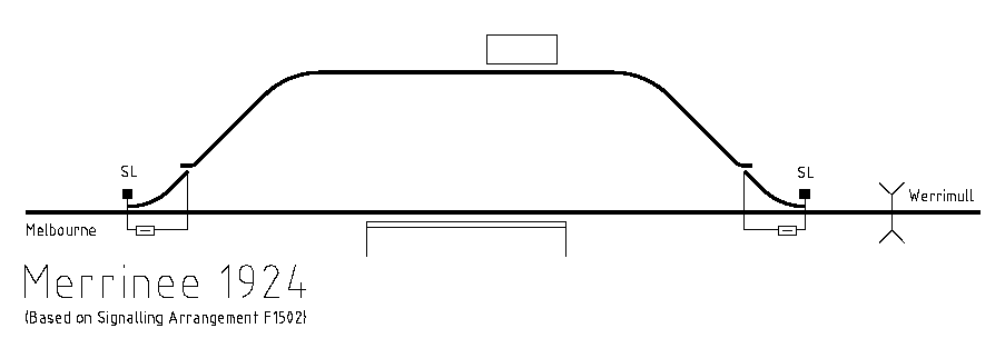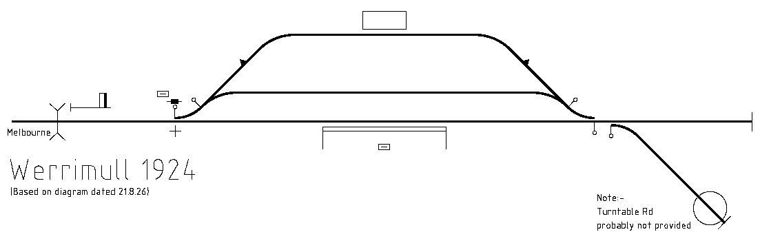 Construction trains first used the line from Redcliffs to Werrimull with an up home signal provided for the new line on 1-3-1923. A 4-lever interlocking frame was provided on the platform and an annett lock secured the junction points to the branch line.