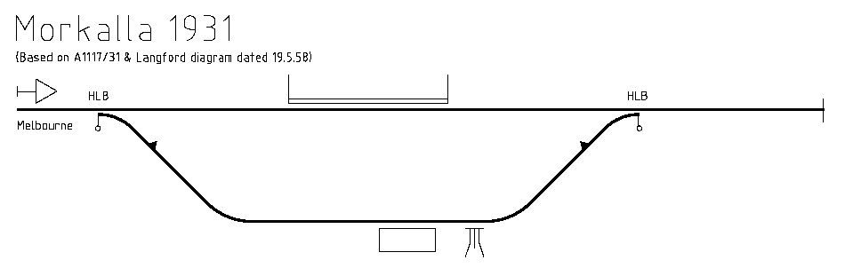 Morkalla was opened as an extension from Meringur on 16-6-1931 under No One in Charge conditions and as a Train Staff and Ticket station for the section Meringur - Morkalla. No signals were provided and the Up end points were secured by a Hand Locking Bar and padlock. A Location Board was provided at the Up end.